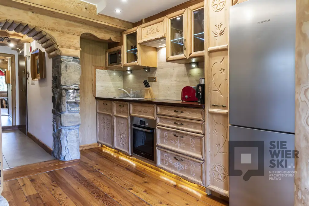 Na sprzedaż trzypokojowy apartament o pow. 48,2 m2, w pełni wykończony i umeblowany z dbałością o detale. Obiekt zlokalizowany wśród zapierających dech widoków górskiego krajobrazu. W bezpośrednim sąsiedztwie szlaków TPN - m.in. wlotu do Doliny Kościeliskiej. Doskonała, gotowa inwestycja zarówno pod kątem osobistego użytkowania, jak i wynajmu krótkoterminowego. OFERTA ======== Prezentowany lokal charakteryzuje się przemyślanym rozkładem, obejmującym: - aneks kuchenny z jadalnią i salonem - dwie oddzielne sypialnie - łazienka - przedpokój Apartament znajduje się na 2 piętrze budynku o architekturze nawiązującej do stylu podhalańskiego. Wnętrza harmonijnie wpisują się w otaczający górski krajobraz, tworząc idealne miejsce dla osób ceniących sobie wygodę oraz bliskość natury. Miejsce parkingowe na terenie obiektu. MEDIA ====== Ogrzewanie piecem konwekcyjnym oraz kominek. Gminna sieć wodno-kanalizacyjna. Internet. Niskie koszty eksploatacji. LOKALIZACJA ============ Budynek usadowiony w miejscu zacisznym, z dala od ulicznego zgiełku. Doskonała lokalizacja pozwalające cieszyć się wypoczynkiem w zdumiewającym otoczeniu. W niedalekiej odległości są wszystkie udogodnienia jak np. przystanek autobusowy, restauracje i karczmy regionalne, stacja benzynowa. W pobliżu liczne tereny spacerowe z zapierającym dech widokiem na góry. Wlot do Doliny Kościeliskiej oddalony o zaledwie 0,8 km. Droga pod Reglami - 0,4 km Wlot do Doliny Małej Łąki - 2,5 km Wlot do Doliny Chochołowskiej - 3,6 km Stadion Biathlonowy - 1,6 km Zakopane - 2,4 km Krupówki - 6,2 km Chochołowskie Termy - 10,7 km Termy Zakopiańskie - 8,3 km Zapraszamy na prezentację z biurem Siewierski Nieruchomości.