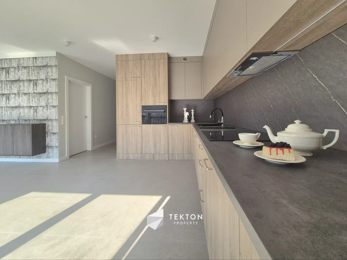 Salon z aneksem kuchennym ( ponad 33 m2 ) Na podłogach położono wielkoformatowe włoskie gresy, Kuchnia zaprojektowana i wykonana przez stolarza zgodnie z projektem dekoratora wnętrz według najnowszych światowych trendów. Użyte zostaną najlepszej jakości materiały firmy Egger. W kuchni zainstalowany zostanie markowy sprzęt AGD. Neutralne kolory otulone ciepłymi barwami naturalnego drewna nadadzą wnętrzu charakteru i elegancji. W korytarzu oraz sypialni zamontowana zostanie duża zabudowa przemyślanie zaprojektowana.